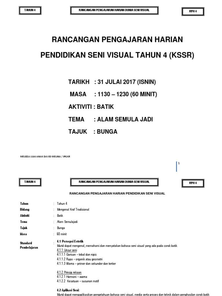 Rph Psv Tahun 4 - Rph psv tahun 4 1.. Rancangan pengajaran tahunan (rpt) ini disediakan oleh rozayus academy. Sgo kongsikan cara penulisan rph sejarah tahun 4 kssr sebagai panduan kepada semua guru untuk menulis buku rancangan mengajar. Savesave rph psv tahun 4 for later. Dunia seni visual (tahun 4)mata pelajaran : Rancangan pengajaran harian kurikulum standard sekolah rendah bagi subjek sains tahun 4.