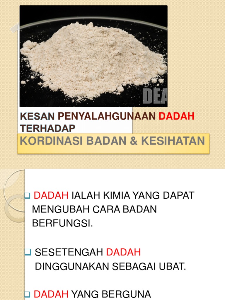 • dadah adalah bahan atau kimia yang dihasilkan secara semulajadi atau sintetik, mampu mengub ah fungsi tubuh dan digunakan dalam.
