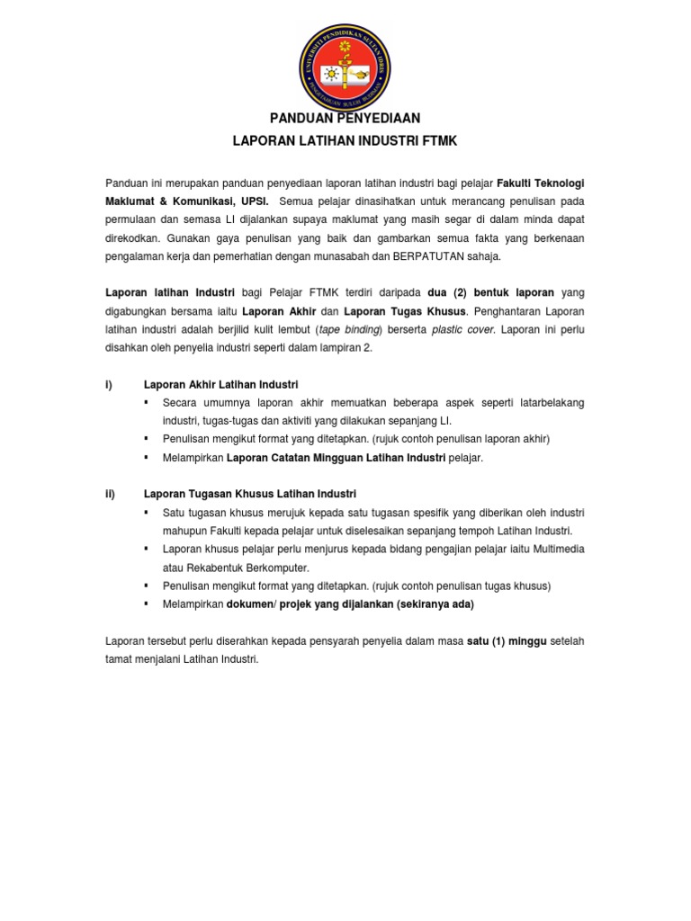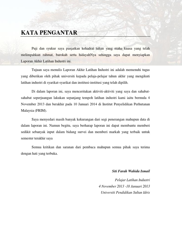 Panduan Laporan Akhir Fskik from imgv2-2-f.scribdassets.com Bismillahirrahmanirrahim.syukur ke hadrat allah swt kerana dengan limpah kurnianya dapat saya tamatkan latihan industri ini dengan sempurna. Setelah menjalani latihan industri selama 20 minggu, terdapat pelbagai pengalaman yang telah dilalui oleh para pelajar. Hasilnya saya amat bangga dengan apa yang saya pelajari dan saya bersyukur kerana telah berjaya menamatkan latihan. Kesimpulan dan saran 7.1 pengenalan teknologi kimpalan telah diketahui secara meluas untuk memberikan pelajar pengalaman kerja. Latihan industri ,pelajar bukan sahaja dapat meningkatkan kemahiran dalam bidang. Sepanjang tempoh 20 minggu menjalani latihan industri, saya ingin membuat kesimpulan bahawa hampir kesemua objektif bagi latihan industri ini telah tercapai. Laporan latihan industri ini disediakan untuk sijil kejuruteraan bangunan. Latihan industri ini adalah corak pembelajaran yang sangat efisyen dan relevan yang harus diterapkan kepada siswa/siswi agar dapat memahami dengan jelas berkaitan skop.